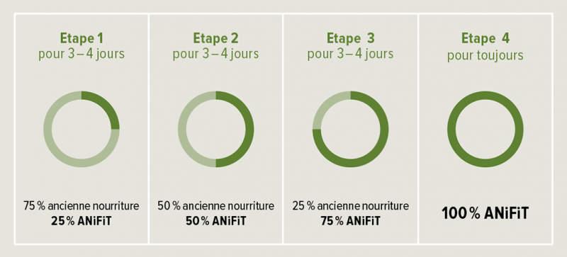 25% de l'alimentation précédente, 75% d'ANiFiT. - Phase 4 (pour toute la durée de vie de l'animal) : 100% d'ANiFiT.